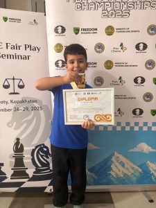 In May 2025, Mehmet captured another national crown at SuperNationals VIII, sweeping the K-1 Championship section with a flawless 7-0 score. He followed this with an impressive top 9 finish at the FIDE World Cup Cadets U8 in Georgia, where he traveled under the care of extended family rather than his parents, proving himself against some of the world’s strongest peers. Most recently, he competed in the Premier Section (U2300) of the Washington International, where his USCF rating soared past 1900, a new milestone for a first grader.
